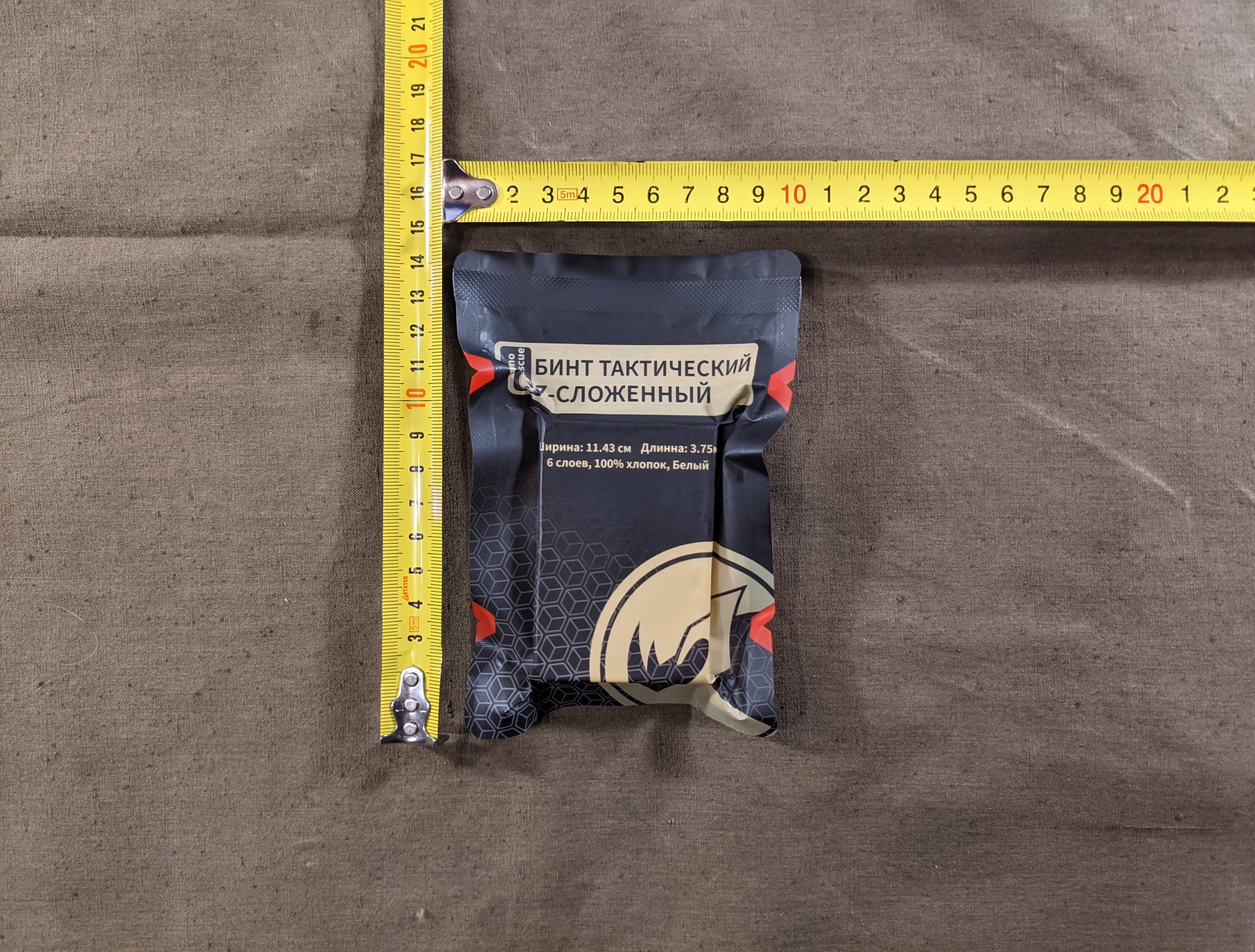 Индивидуальный перевязочный пакет шириной в 4". В вакуумной упаковке, скопирован с еврейского ИПП. Когда тампонада проведена и кровотечение остановлено, то с помощью этого ИПП надо сделать давящую повязку. Бинт эластичный, с подушкой для участка с раной, сама повязка не прокручивается из-за наличия рогов и фиксатора на конце. В версии для этой аптечки, надписи на упаковке на русском языке.